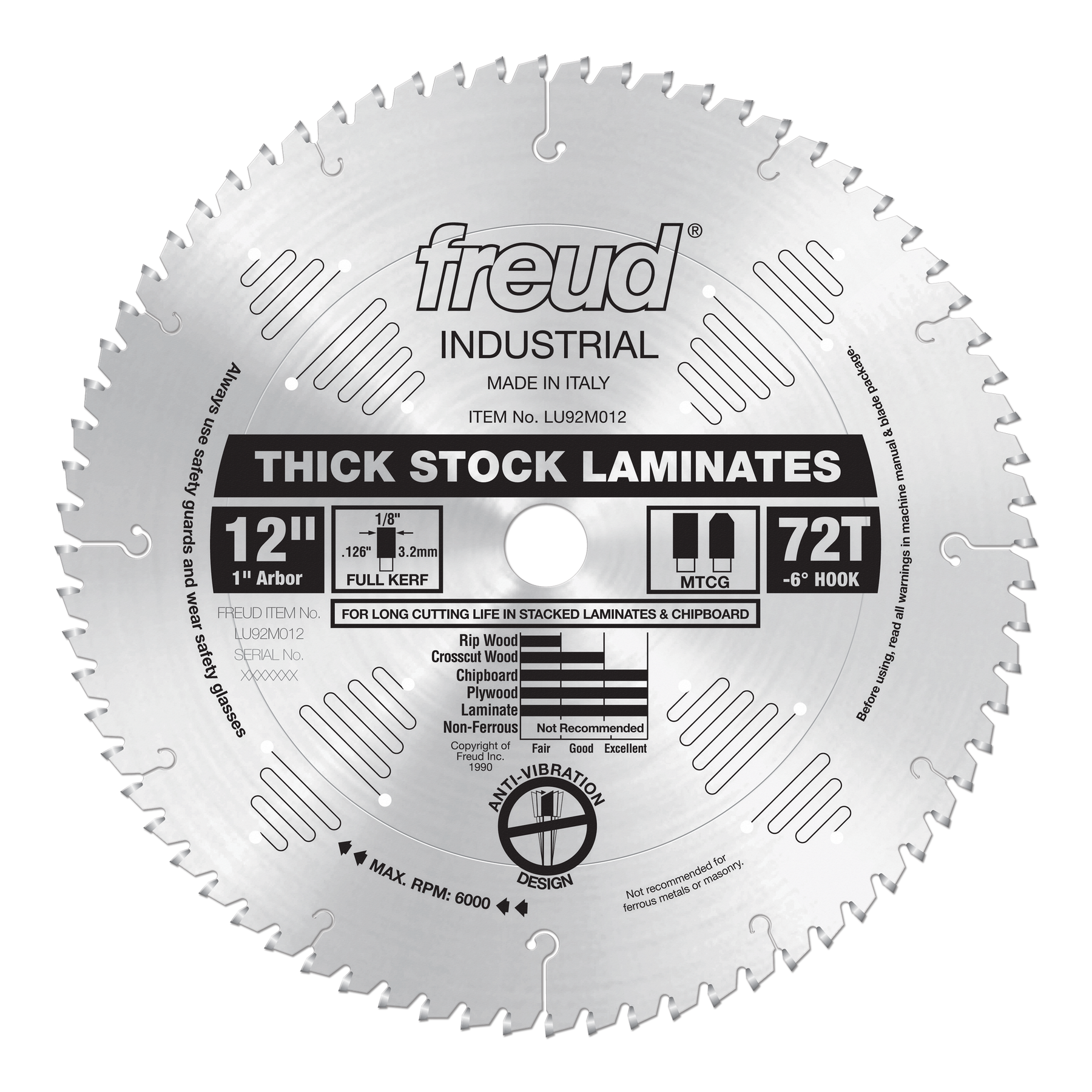 This heavy-duty production blade produces an excellent finish on the top and bottom of thick laminates and melamine. The LU92M series is ideal for cutting stacked 3/4" laminates and melamine. Each tooth has a special modified triple chip grind design created by computer simulation to breeze through thick stock and single or double-sided laminates, leaving a chip-free edge.